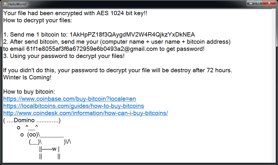 » Cifra el contenido de los archivos a través del algoritmo AES 256 y agrega la extensión .domino a cada uno de ellos.