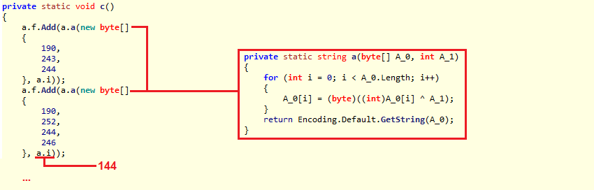 La función c() adhiere a una lista cada uno de los diferentes tipos de archivo a modificar, esta información se encuentra codificada a través de la función XOR con llave 144.