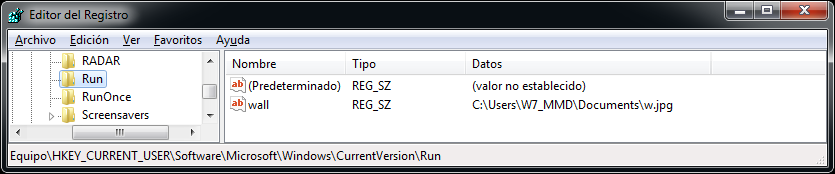 » De la misma manera decodifica y crea la llave de registro: SOFTWARE\\Microsoft\\Windows\\CurrentVersion\\Run\\wall encargada de ejecutar y mostrar la imagen w.jpg en cada inicio del sistema.