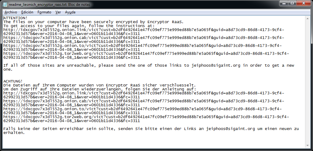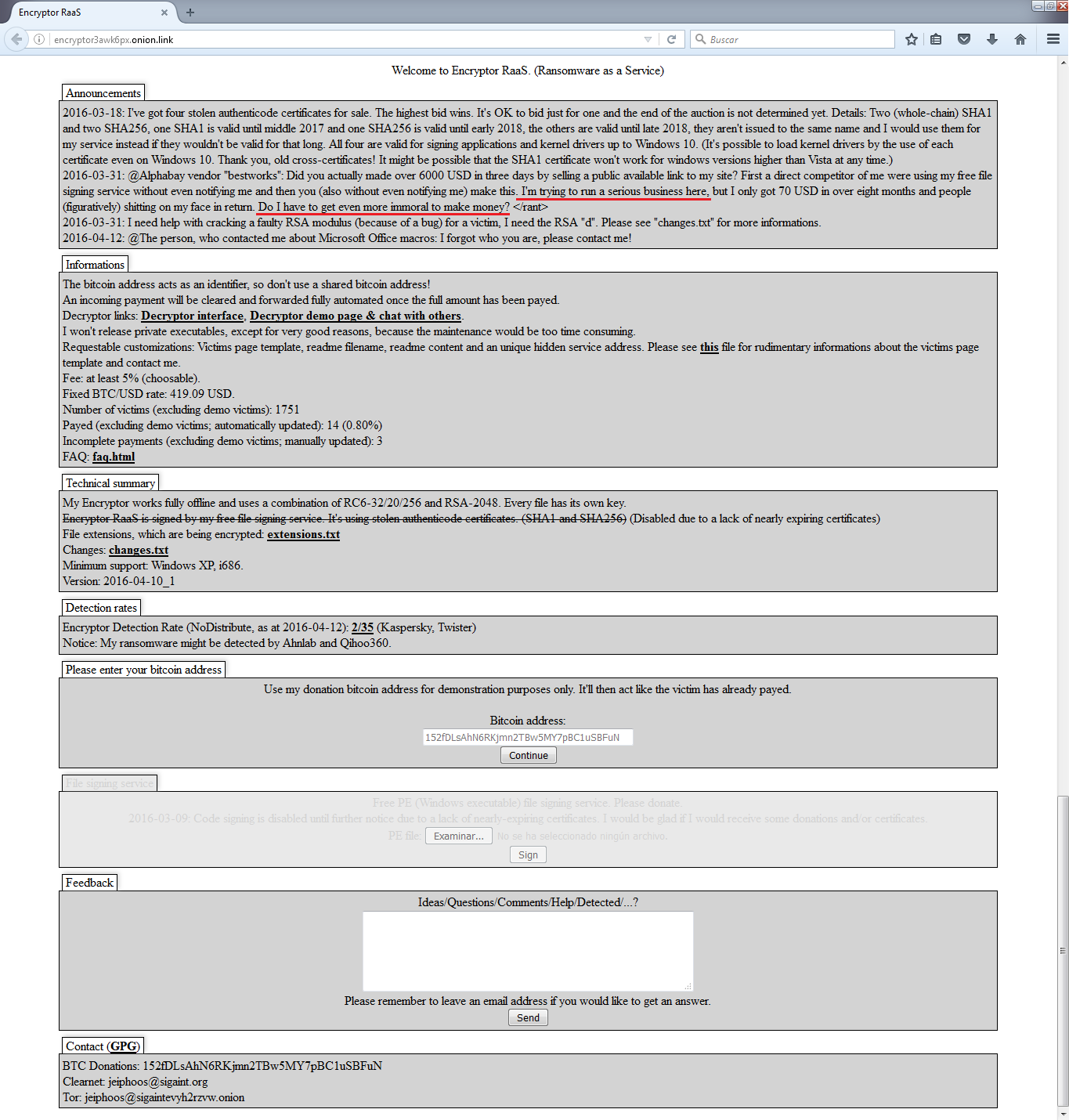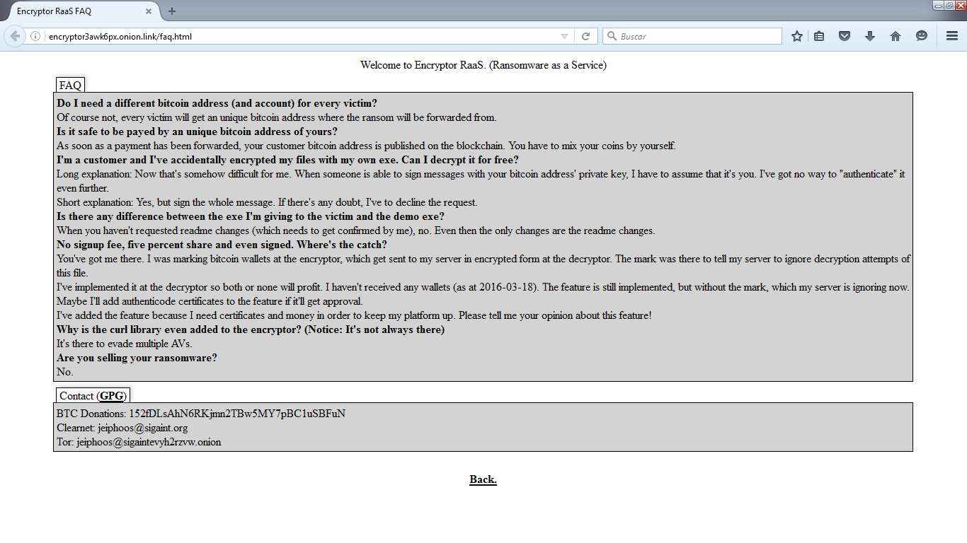 Esta interface permite conocer todos los detalles de la creación y modificaciones efectuadas sobre el troyano así como establecer una comunicación directa con el autor con el fin de realizar mejoras sobre el mismo: encryptor3awk6px.onion.link