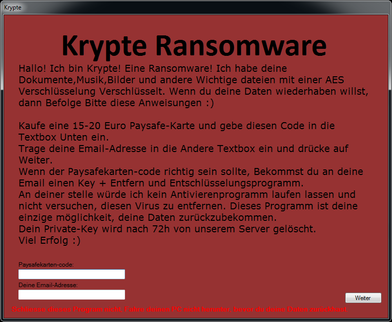 Hallo! Ich bin Krypte! Eine Ransomware! Ich habe deine Dokumente,Musik,Bilder und andere Wichtige dateien mit einer AES Verschlüsselung Verschlüsselt. Wenn du deine Daten wiederhaben willst, dann Befolge Bitte diese Anweisungen :)