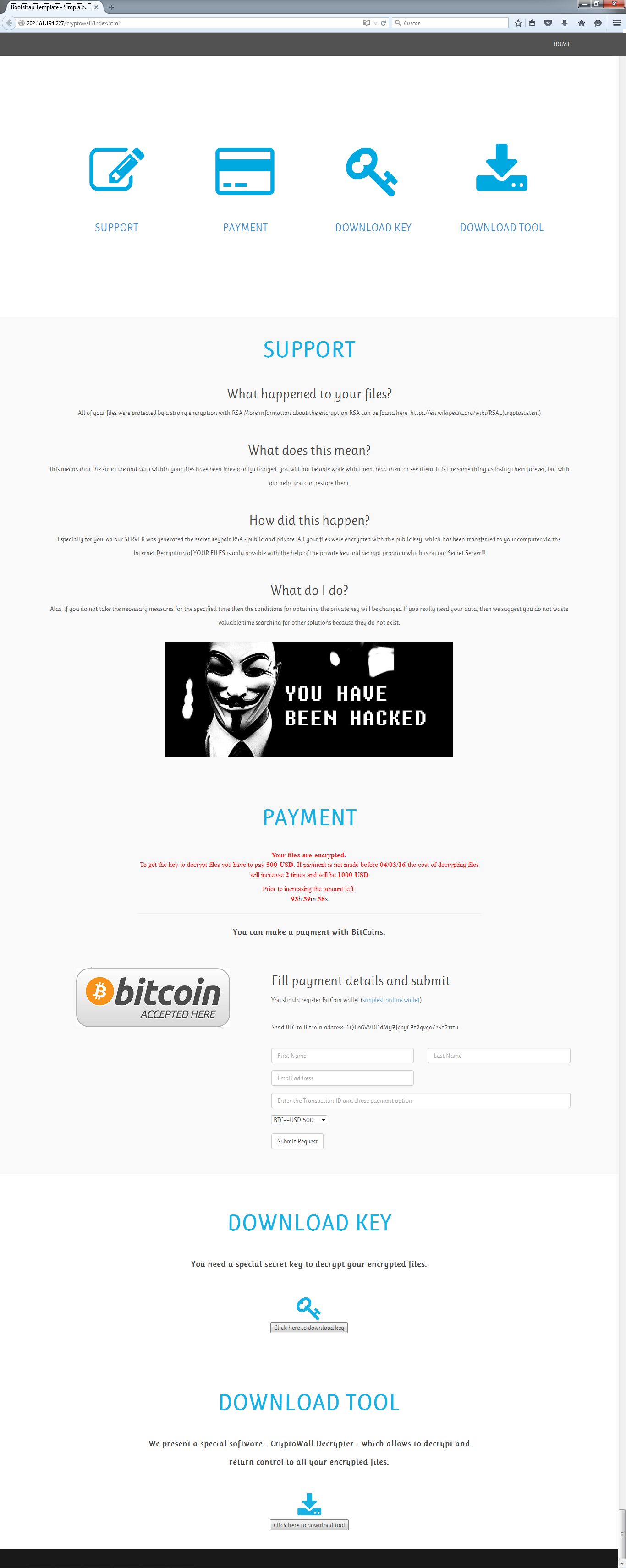 Finalmente el troyano (como es habitual) modifica el fondo de pantalla de la víctima informando al usuario del daño ocasionado sobre la información, cuando este da click en el botón "Pay" se realiza una nueva petición HTTP a una página Web ubicada en el mismo servidor C&C en la ruta /cryptowall/index.html, en este sitio Web (el cual utiliza plantillas estándar de Internet) es posible consultar toda la información de soporte, pago (billetera Bitcoin a la cual se debería hacer la transacción) y "descarga" de la clave y aplicación con la cual se podrán descifrar los archivos comprometidos.