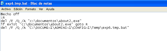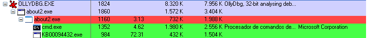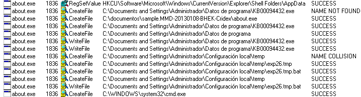 Al ejecutar el gusano about.exe se puede identificar la creación de los archivos KB00094432.exe, exp26.tmp, exp26.tmp.bat y el uso de la cmd.exe.