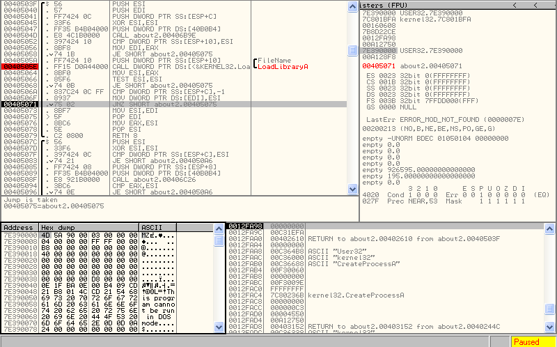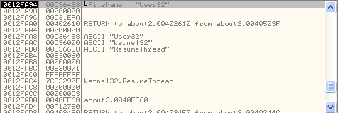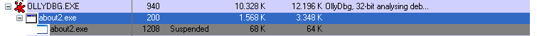 Así mismo se identifica el proceso de creación y eliminación de los archivos. Mediante la función CreateProcessA se crea otra instancia del proceso about.exe en estado suspendido