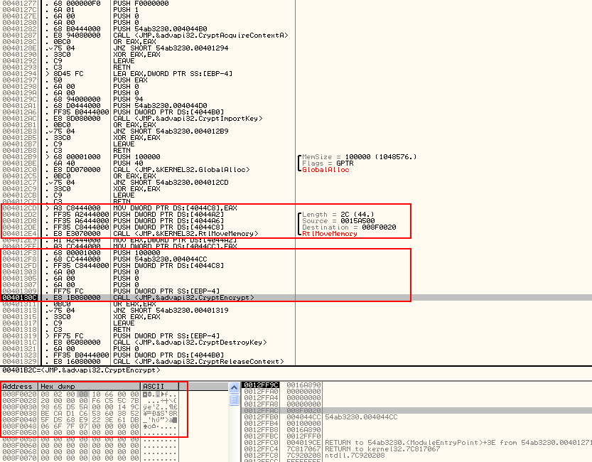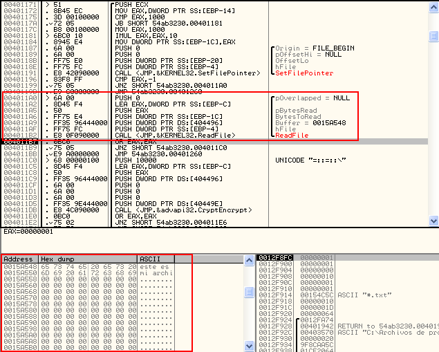 En la siguiente función en la posición 0x00401271 se importa la llave creada en la función anterior y se cifra por medio de la función CryptEncrypt.