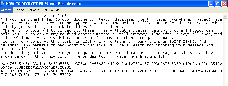 Al examinar el contenido del archivo txt se incita al usuario a pagar una suma de dinero (120$) enviando un código al correo datafinder(at)fastmail.fm