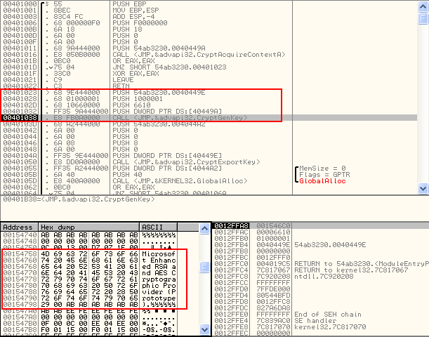 Posteriormente se ejecuta la función en la posición 0x00401000 la cual crea la llave RSA que será usada para cifrar los archivos
