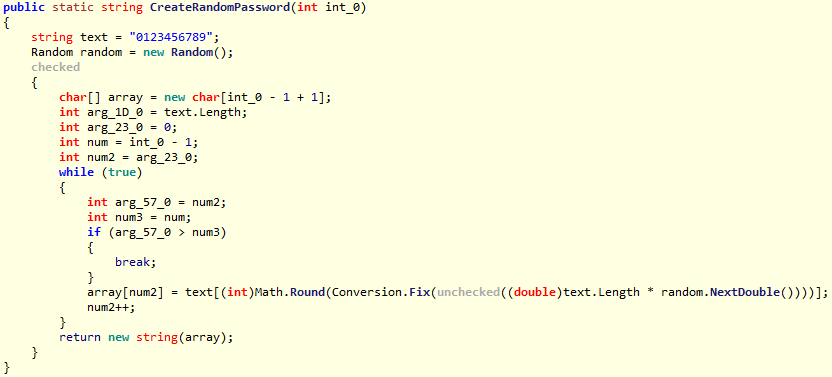 El password que utiliza para cifrar/descifrar los archivos está compuesto de 20 números creados de forma aleatoria, dicho valor es almacenado en el registro del sistema Operativo hasta que es enviado mediante correo electrónico, una vez esto sucede dicha llave es eliminada.