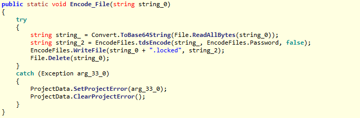 - Decodifica nuevamente dichos caracteres y los escribe en un nuevo archivo eliminando la cadena de texto ".locked".