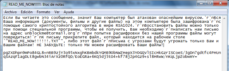 If you are reading this message, it means that your computer has been attacked by a dangerous virus. `R` nVsya Your information (documents, movies, and other files) on the computer was encrypted `r` nc using the most cryptographically world RSA1024. `R` nVosstanovit files only through a special program. To obtain it, you have to `r` nnapisat us an email to unblockme(at)tormail.org `r` nThe attempt decryption without our program files may be damaged! `R` nThe letter attach a file that is on the desktop `" READ_ME_NOW!! !!!!. TXT `", or the file `r` nPisma threats will only threaten you and your files! DO NOT FORGET: Only we can decode your files!
