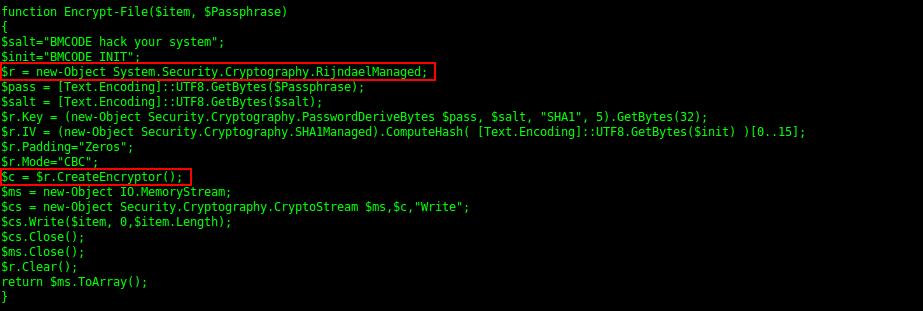 Seguido a esto se ejecuta la función que permite cifrar los archivos con el algoritmo Rijndael symmetric key encryption por medio de la función CreateEncryptor de PowerShell.