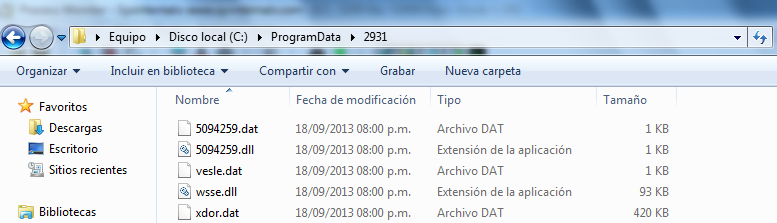 Dichos archivos son creados con nombres aleatorios y dependen directamente de la versión del sistema operativo en la que se ejecutó el troyano. Para el caso de Windows 7 la librería tiene el nombre de wsse.dll (93.0 KB), en Windows XP la librería se crea con el nombre de Imbd.dll (86.5 KB).