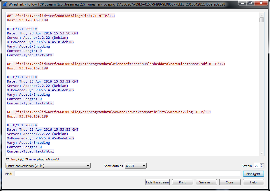 Posteriormente envía la información de las rutas y diferentes archivos modificados a servidores de C&C ubicados en las direcciones IP: 93.170.169.180 y 46.8.45.174 (Ukraine Chop Pe Dunaeivskyi Denys Leonidovich / AS21100 ITLDC-NL ITL Company)