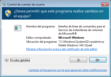 Valida la versión del sistema operativo con el fin de ejecutar una función encargada de decodificar las instrucciones y ejecutar el proceso vssadmin.exe; esto para eliminar todas las copias de los archivos almacenadas localmente en el equipo: