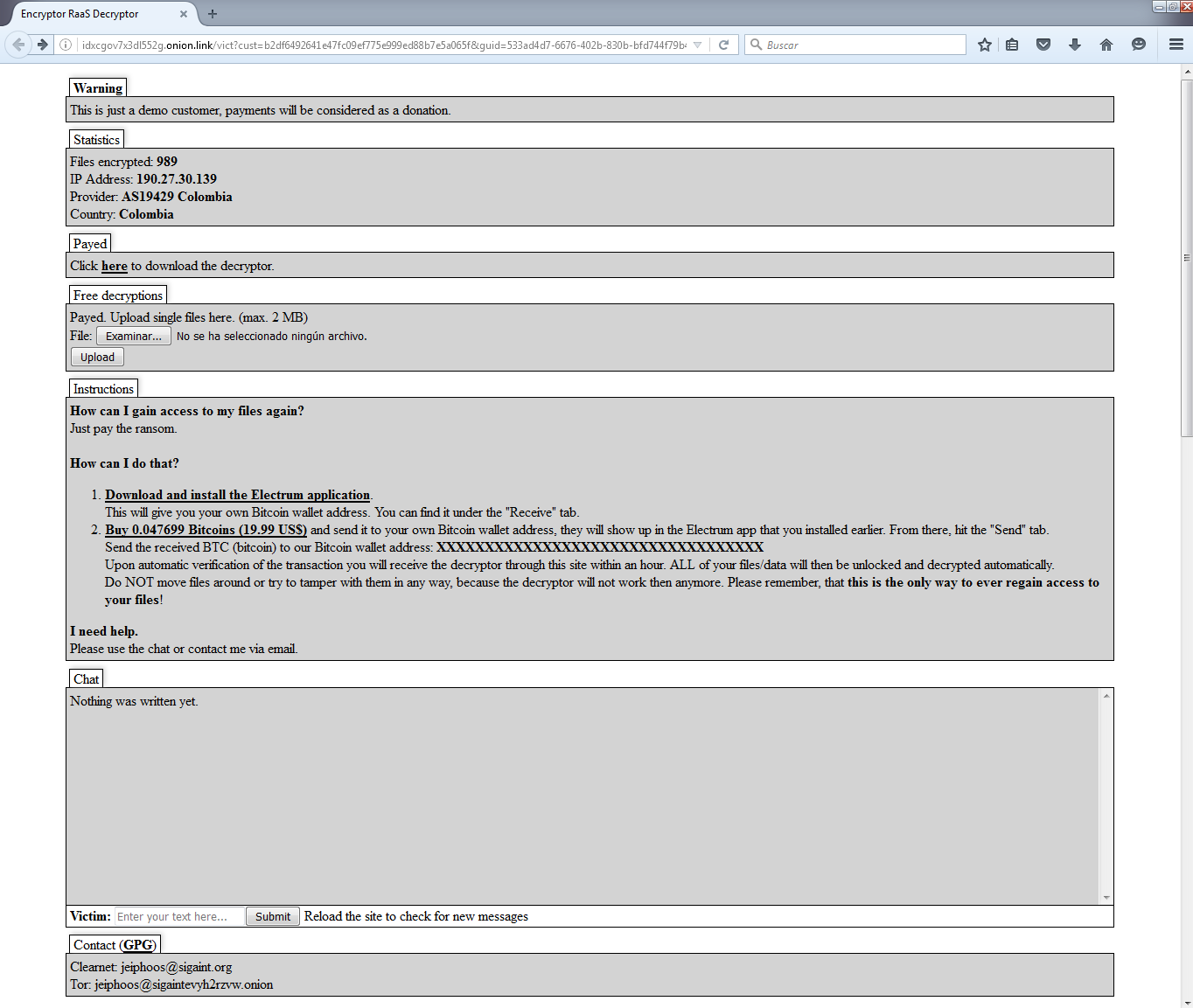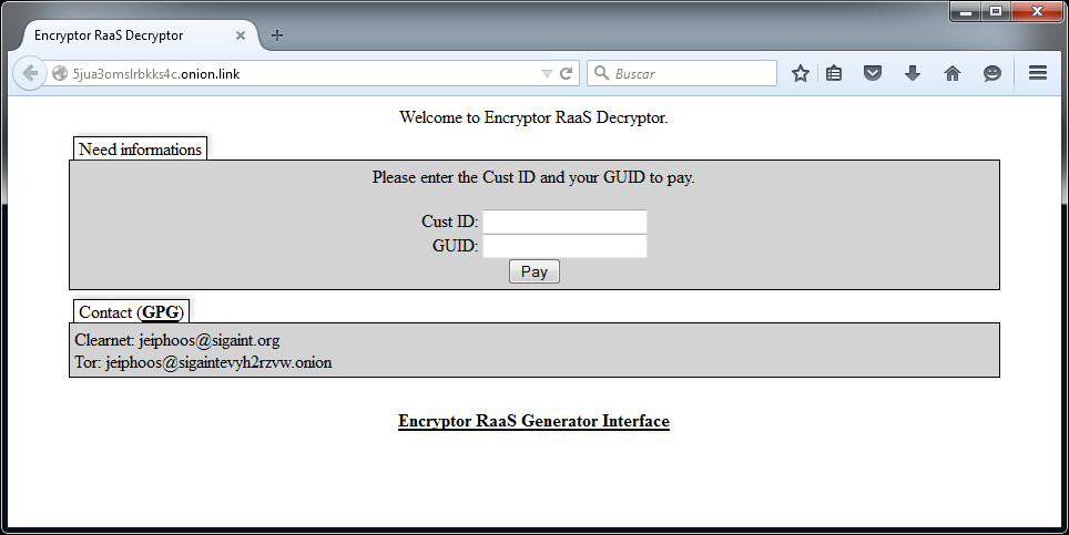 Esta interface permite conocer todos los detalles de la creación y modificaciones efectuadas sobre el troyano así como establecer una comunicación directa con el autor con el fin de realizar mejoras sobre el mismo: encryptor3awk6px.onion.link