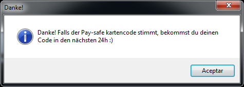 Danke! Falls der Pay-safe kartencode stimmt, bekommst du deinen Code in den nächsten 24h :)