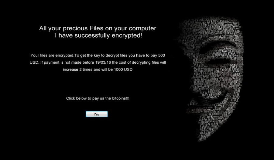 Troyano del tipo Ransomware que cifra el contenido de todos los archivos encontrados en la carpeta Documentos a través del algoritmo AES-256 para recuperar la información requiere de un pago de 500 a 1000 UDS.
