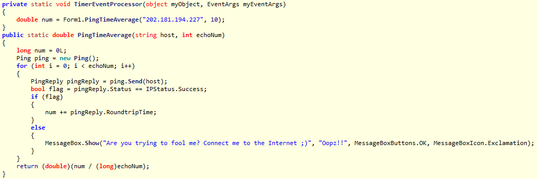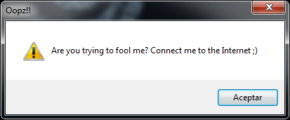 Si no es posible realizar una conexión exitosa con el servidor C2 se muestran dos mensajes al usuario con los contenidos: Oopz!! URL not reachable y Oopz!! Are you trying to fool me? Connect me to the Internet ;). Este último mismo mensaje puede aparecer constantemente de no ser detectada una salida a Internet, esto debido a la implementación de las funciones TimerEventProcessor y PingTimeAverage que periódicamente envían paquetes ICMP Echo Request/Ping al servidor.