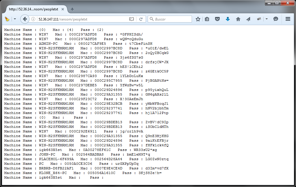 A través de nuevos ejemplares de este tipo de Ransomware se detectó un nuevo servidor de comando y control en la dirección IP: 52.36.147.111 (United States - AS16509 AMAZON-02 - Amazon.com, Inc.), aunque la página principal no ha tenido ningún tipo de modificación existe sin embargo un archivo llamado peopletxt el cual permite identificar fácilmente las diferentes contraseñas para cada uno de los usuarios infectados.