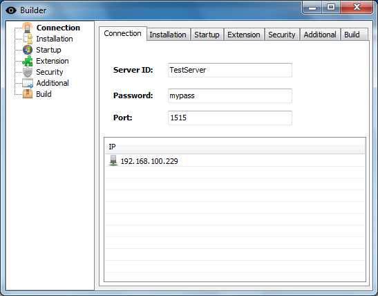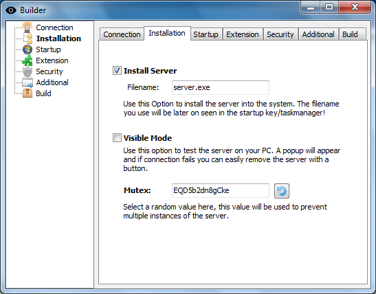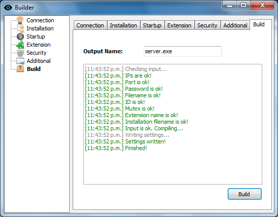 El archivo cliente tiene la opción de Builder, la cual permite crear el archivo server.exe con ciertas opciones de configuración: