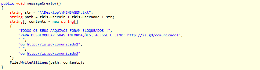 Define la ubicación (\\Desktop) y los diferentes tipos de archivo que serán cifrados por medio de la función EncryptFile (quizá se trate de una versión inicial ya que únicamente modifica el contenido de los archivos que se encuentran en el escritorio):
