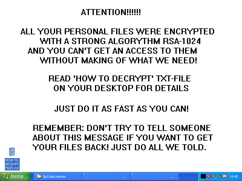 Al ejecutar el troyano se modifica la imagen de fondo del escritorio de Windows donde se informa al usuario de la situación comprometida de la maquina y lo obliga a leer el archivo HOW TO DECRYPT FILES.txt