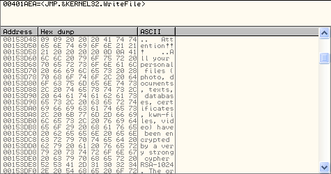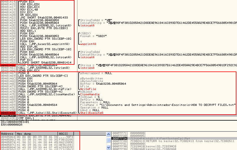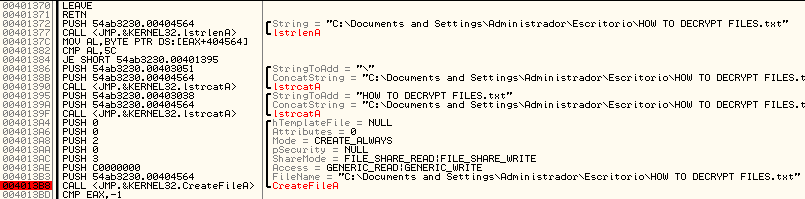 Posteriormente continúa con la creación del archivo HOW TO DECRYPT FILES.txt y lo muestra en pantalla.