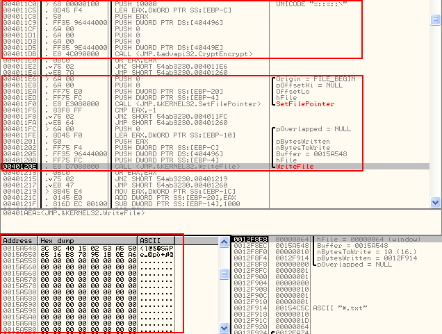 En la siguiente función en la posición 0x00401271 se importa la llave creada en la función anterior y se cifra por medio de la función CryptEncrypt.