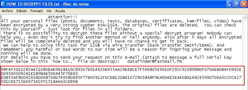 Al examinar el contenido del archivo txt se incita al usuario a pagar una suma de dinero (120$) enviando un código al correo datafinder(at)fastmail.fm