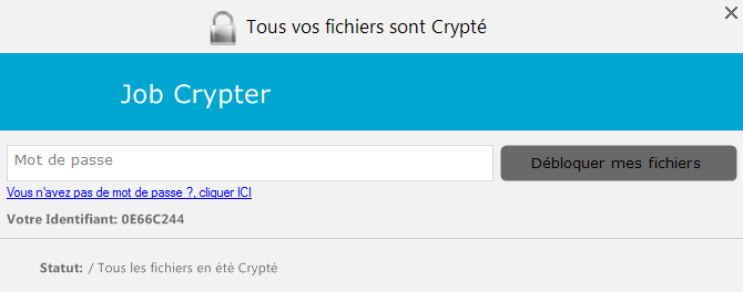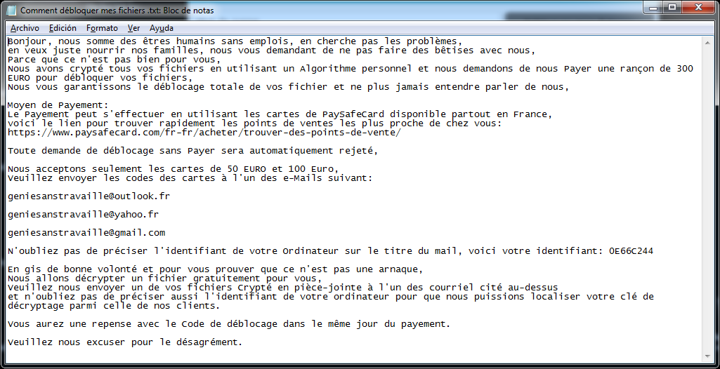 Troyano del tipo Ransomware que ataca principalmente a personas en Francia, para regresar los archivos requiere de un pago de 300 Euros.