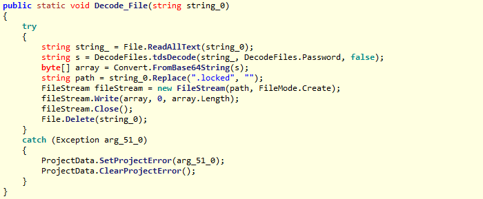 - Decodifica nuevamente dichos caracteres y los escribe en un nuevo archivo eliminando la cadena de texto ".locked".