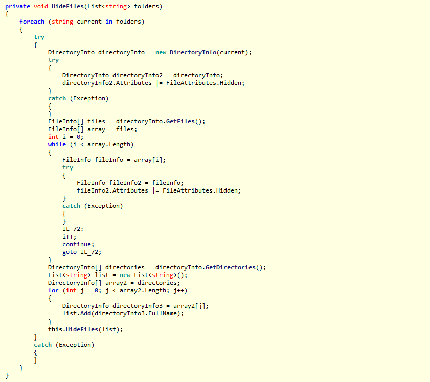 Finalmente realiza una modificación sobre todos las carpetas y archivos almacenados en cada una de las particiones del disco duro y les activa el atributo oculto (Hidden) de forma tal que estos no puedan ser visualizados por las víctimas.