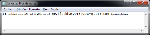 (: لقد تم تشفير ملفاتكم، لفك الشفرة فلكسي موبيليس للعنوان التالي me.blackhat20152015@mt2015.com وشكرا على كرمكم مسبقا