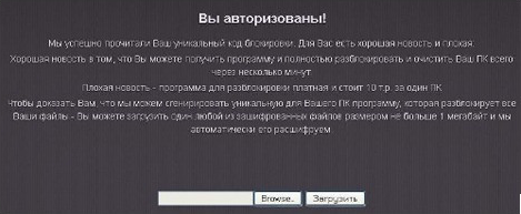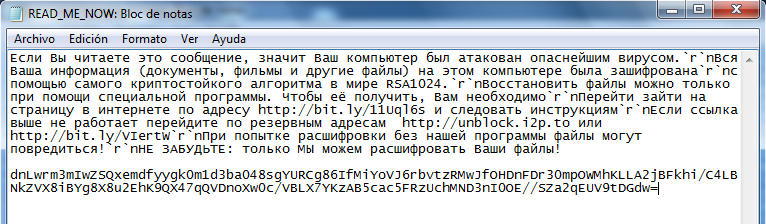 If you are reading this message, it means that your computer has been attacked by a dangerous virus. `R` nVsya Your information (documents, movies, and other files) on the computer was encrypted `r` nc using the most cryptographically world RSA1024. `R` nVosstanovit files only through a special program. To obtain it, you have to `r` nGo go to the page on the Internet at http://bit(dot)ly/11Uql6s and follow the `r` nIf the link above does not work, go to a backup to http://unblock(dot)i2p.to or http://bit(dot)ly/VIertW `r` nThe attempt to decrypt the files without our software can be damaged! `r` nNo FORGET: only we can decrypt your files!