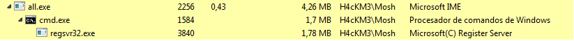 Al ejecutar el troyano se crea una instancia de los procesos cmd.exe y regsvr32.exe los cuales en conjunto tienen la finalidad de crear y descargar los diferentes archivos de configuración y librerías que serán inyectadas en los procesos pertenecientes a los diferentes navegadores web como Firefox, Chrome e Internet Explorer.