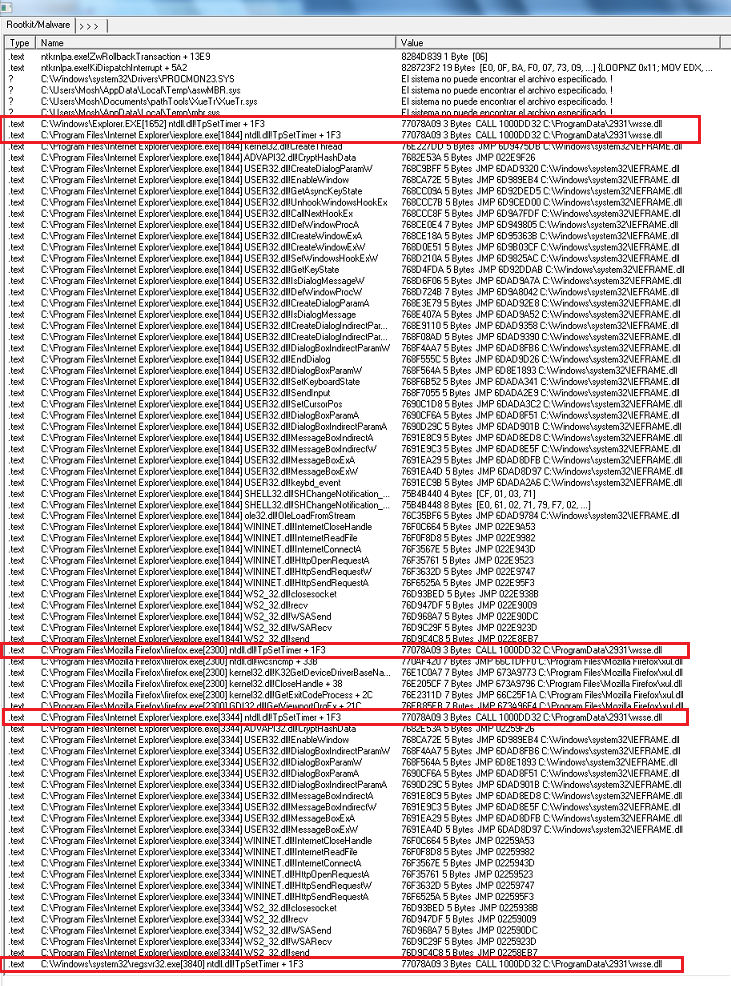 Se puede observar cómo se crean Hooks a los procesos Explorer.exe, firefox.exe, iexplore.exe y regsvr32.exe con el fin de que estos inicialicen la librería maliciosa y sea posible realizar la captura de datos.
