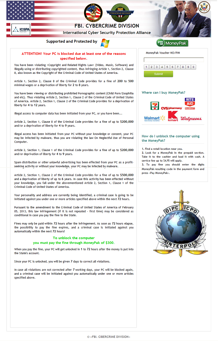 Este troyano es del tipo ransomware, también es llamado el virus de la policía debido a que el mensaje que bloquea la pantalla del usuario infectado pertenece a dicha organización, por lo general la imagen corresponde con la entidad policial del país del equipo amenazado.