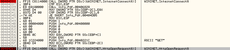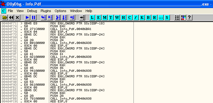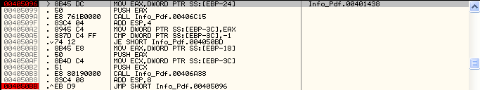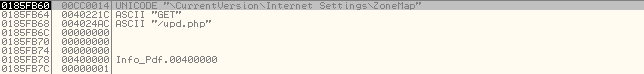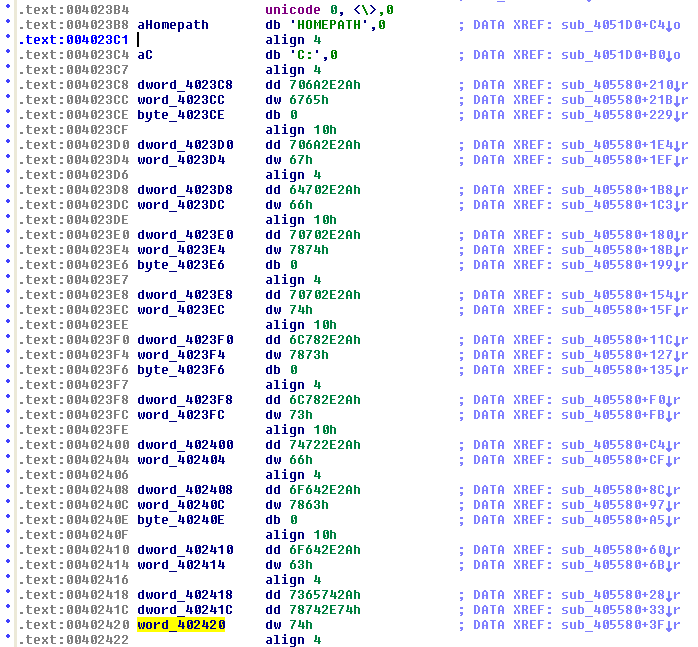 El troyano comienza su ejecución extrayendo las extensiones de los archivos que va a cifrar, la función en la posición 00405580 es la encargada de traer dicha información y ubicarla en memoria para ser usada por la función de cifrado posterior, la siguiente imagen muestra los valores hexadecimales correspondientes a las siguientes extensiones: *.jpeg, *.jpg, *.pdf, *.pptx, *.ppt, *.xlsx, *.xls, *.rtf, *.docx, *.doc, *test.txt |
