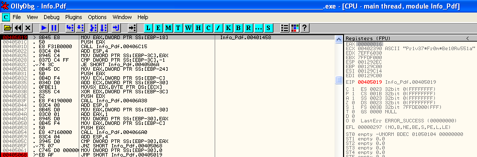 Cuando encuentra un archivo con la extensión indicada procede a cifrar su información, primero compara las primeras letras del archivo con la cadena *AES* de ser así finaliza el proceso de lo contrario procede a leer todo el texto del archivo y cifra cada una de las letras del mismo “XOR” cada una de las letras de la clave: Pr1v37*Fr0m*Be10Ru551a (0040503B) hasta el final del mismo en 00405028 donde finaliza el proceso